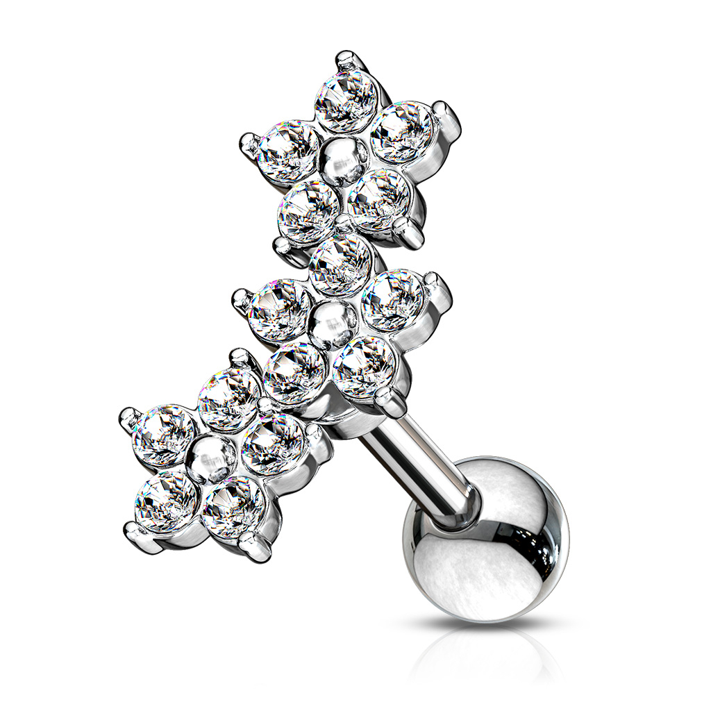 Ten prezentowany kolczyk jest idealny do przekłucia helix. Trzy kwiaty mają lekko zakrzywioną formę, która idealnie podąża za krawędzią ucha. Przednia część ma około 12 mm długości, oraz składa się z 3 kwiatów zdobionych cyrkoniami, które można wybrać w kilku kolorach.