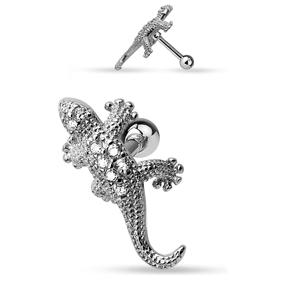 Kolczyk ten nadaje się idealnie do przekłucia tragus, a jaszczurka będzie wtedy wyglądać jakby wchodziła lub wychodziła z twojego ucha w zależności gdzie jest umieszczony jej głowa i ogon. Masz także opcję noszenia jej w piercingu helix lub w płatku ucha, wystarczy że zdecydujesz w którą stronę będzie skierowana. Grzbiet gada jest ozdobiony jasnymi kamieniami, które rozświetlają biżuterię w świetle.
