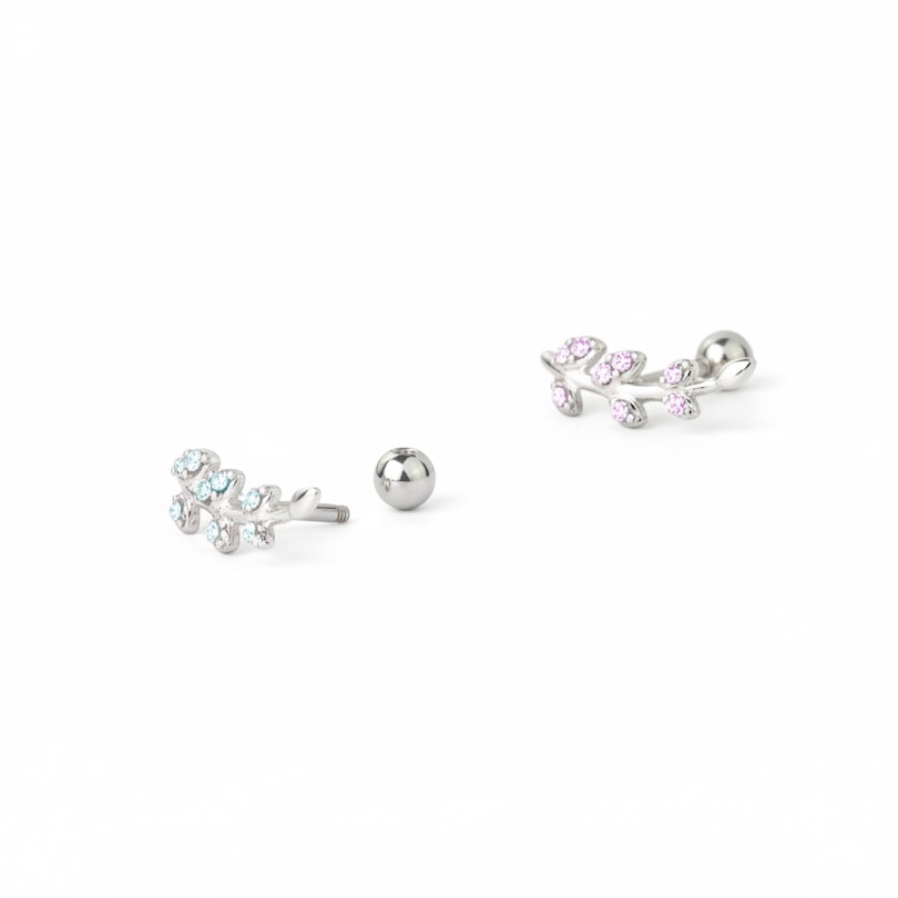 Pręcik jest wykonany ze stali chirurgicznej, która jest solidnym i wytrzymałym materiałem. Ma on 1,2 mm grubości, a jego forma przypomina gałązkę, która jest lekko wygięta. Po obu stronach widać listki, które zdobione są małymi cyrkoniami w kolorach do wyboru. Wszystkie odnajdziesz powyżej obok zdjęcia.