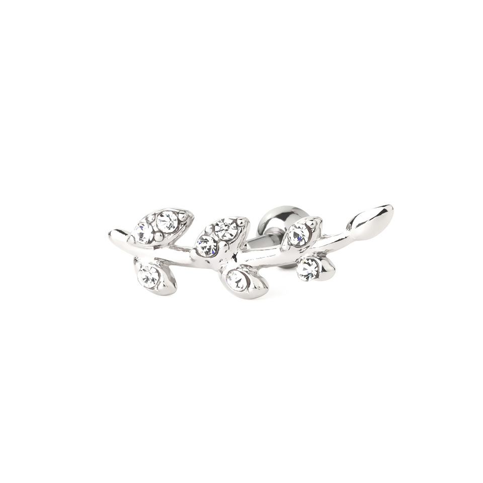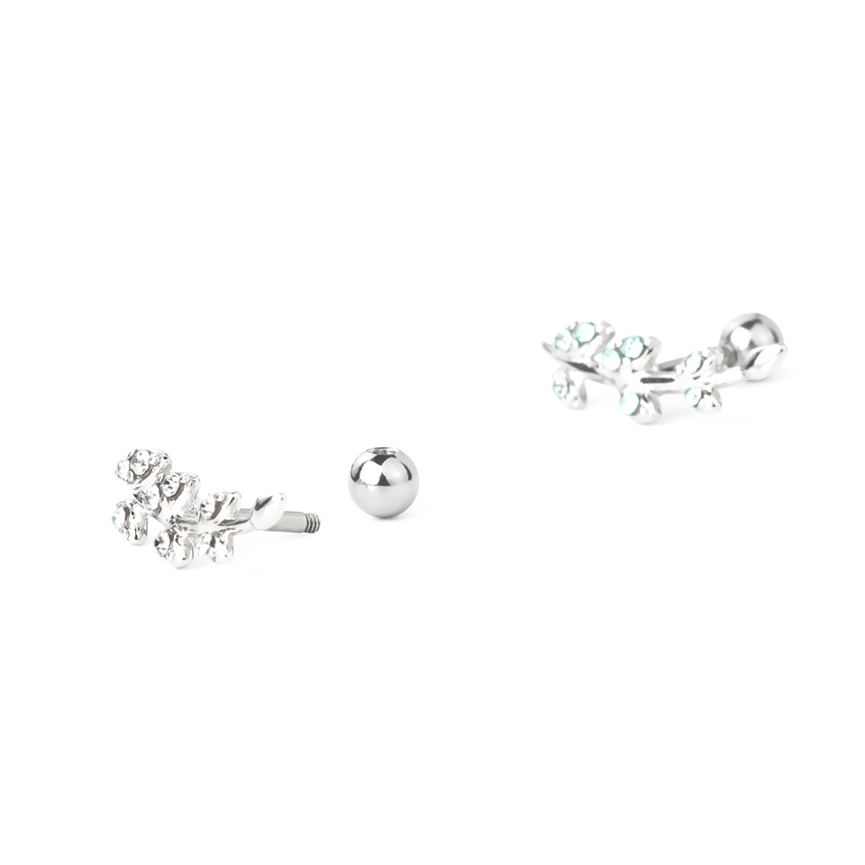 Pręcik jest wykonany ze stali chirurgicznej, która jest solidnym i wytrzymałym materiałem. Ma on 1,2 mm grubości, a jego forma przypomina gałązkę, która jest lekko wygięta. Po obu stronach widać listki, które zdobione są małymi cyrkoniami w kolorach do wyboru. Wszystkie odnajdziesz powyżej obok zdjęcia.