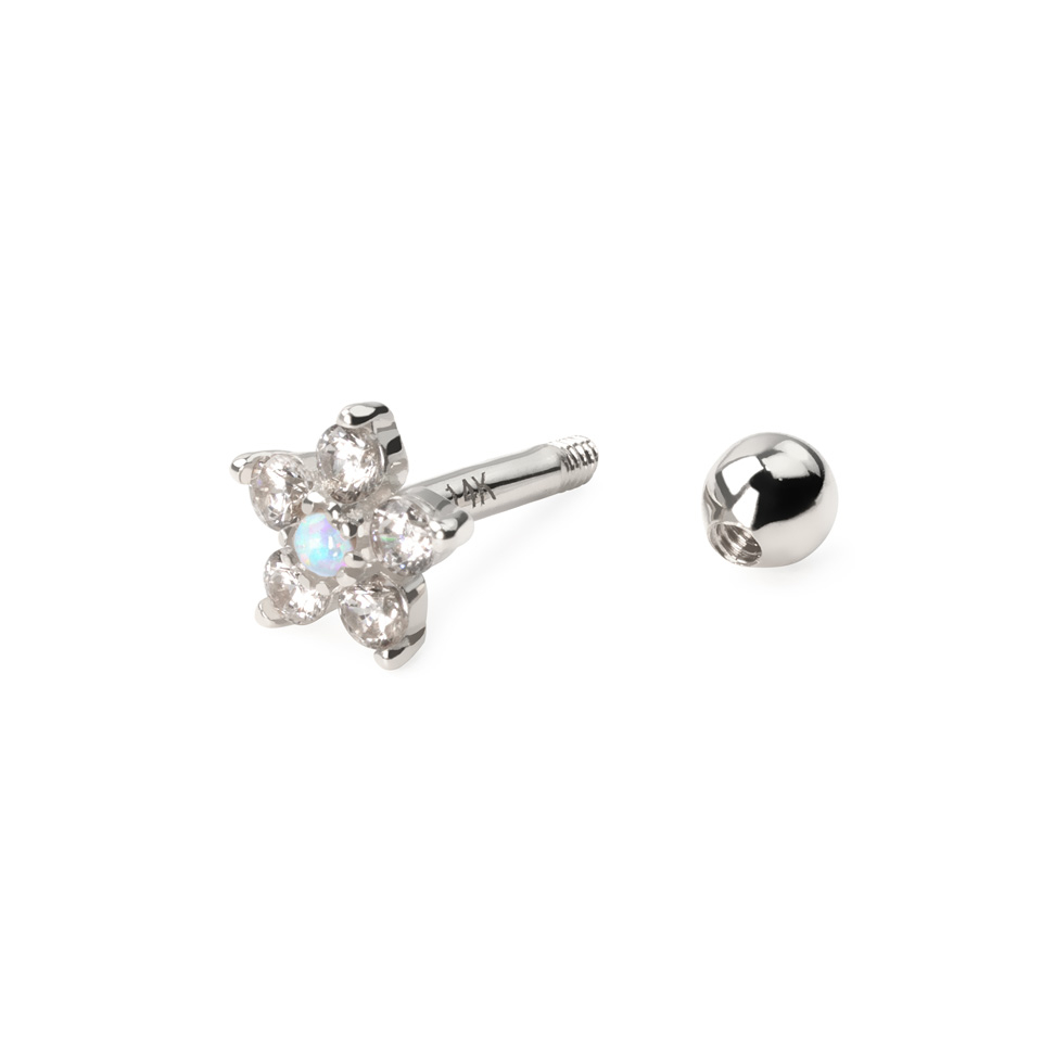 Ozdobną częścią kolczyka jest mały kwiatek, który stanowi centralny punkt i jest on wypełniony opalizującym kamieniem oraz pięcioma kryształkami osadzonymi na każdym z pięciu płatków.