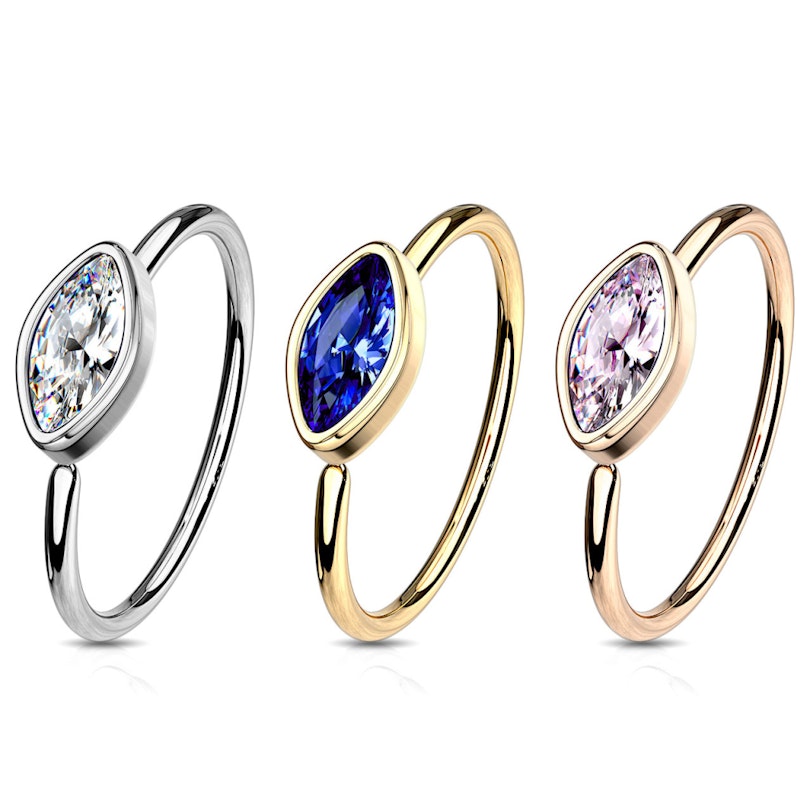 To kółko do nosa jest wykonane ze stali chirurgicznej, ma 0,8 szerokości i 8 mm średnicy oraz nadaje się idealnie do przekłucia nosa. Możesz go włożyć zginając i obracając. Z przodu biżuterii odnajdziemy piękny owalny kamień, ta część biżuterii jest wykonana z mosiądzu, który został pokryty warstwą koloru, dzięki czemu ma ten sam kolor co kółko. Jak zdążyłeś zauważyć na zdjęciu, oferujemy kilka kolorów kolczyka, złota wersja została pokryta warstwą 14 karatowego złota, co nadaje biżuterii ekskluzywnego wyglądu.