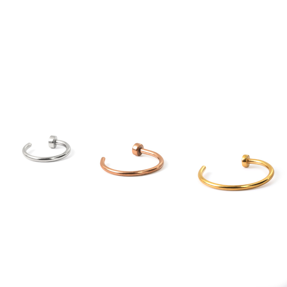 W naszym sklepie kółko do nosa jest dostępne w kilku różnych modelach. Oczywiście, wszystkie mają formę okręgu. To tutaj na przykład składa się z jednego kawałka metalu uformowanego w kształcie litery "C". Na jednym końcu kolczyka umieszczony jest mały element, który zapobiega wypadaniu kolczyka z nosa. Drugi koniec jest całkowicie gładki, nieco zaokrąglony i pozbawiony dodatkowych elementów, tak by łatwo się go wkładało. Tylko ty wybierasz grubość, średnicę i kolor kolczyka spośród kilku oferowanych opcji.