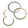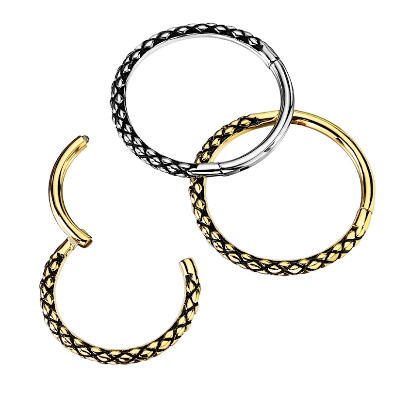 Kółko segmentowe z małym zawiasem, zdobione skórą węża co nadaje mu odważnego i wyjątkowego wyglądu. Biżuteria jest oferowana w srebrnej i złotej wersji, w obydwu została użyta technika oksydowania, aby nadać jej efektu skóry węża. Kółko ma dwa rozmiary: 8 mm i 10 mm, oraz grubość gwintu 1 mm lub 1.2 mm.