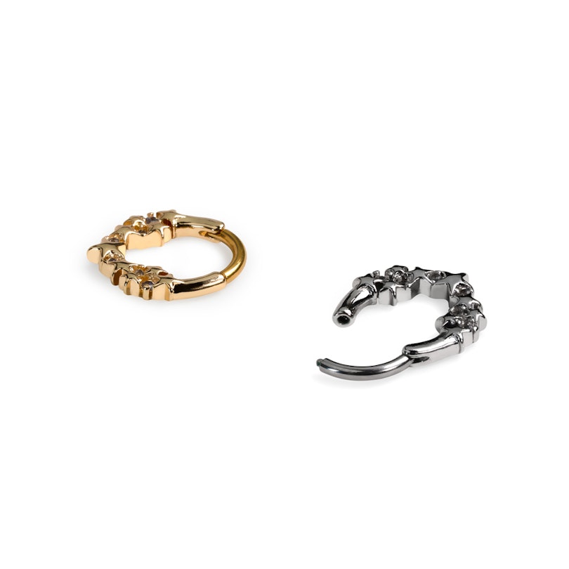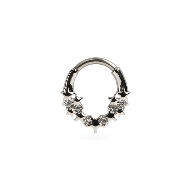 Kółko skierowane do przodu z gwiazdami i księżycami, które stanie się świetnym dodatkiem w Twojej kolekcji. Otwiera się je zawiasem, które ułatwia jego zakładanie i świetnie zabezpiecza piercing.
