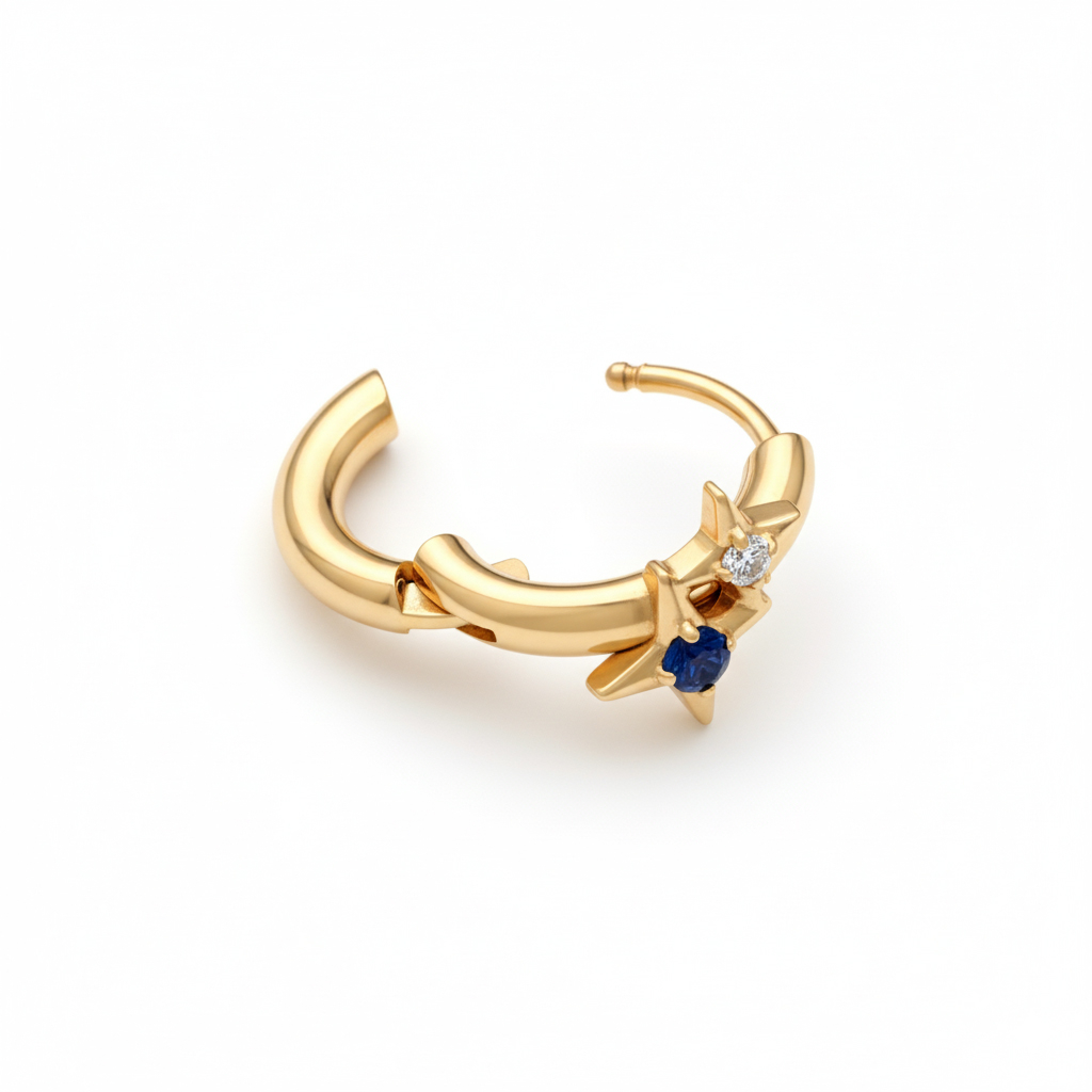 Tytanowy ring z dwiema gwiazdkami dodaje zabawnego akcentu klasycznemu kształtowi huggy. Dwie małe gwiazdki stoją obok siebie, każda z kolorowym kamieniem osadzonym w delikatnej oprawie z pazurkami, dodając ringowi charakteru, ale bez przesytu. Dostępny w złotym i srebrnym kolorze, łatwo dopasujesz go do bardziej ekspresyjnej kombinacji w uchu.