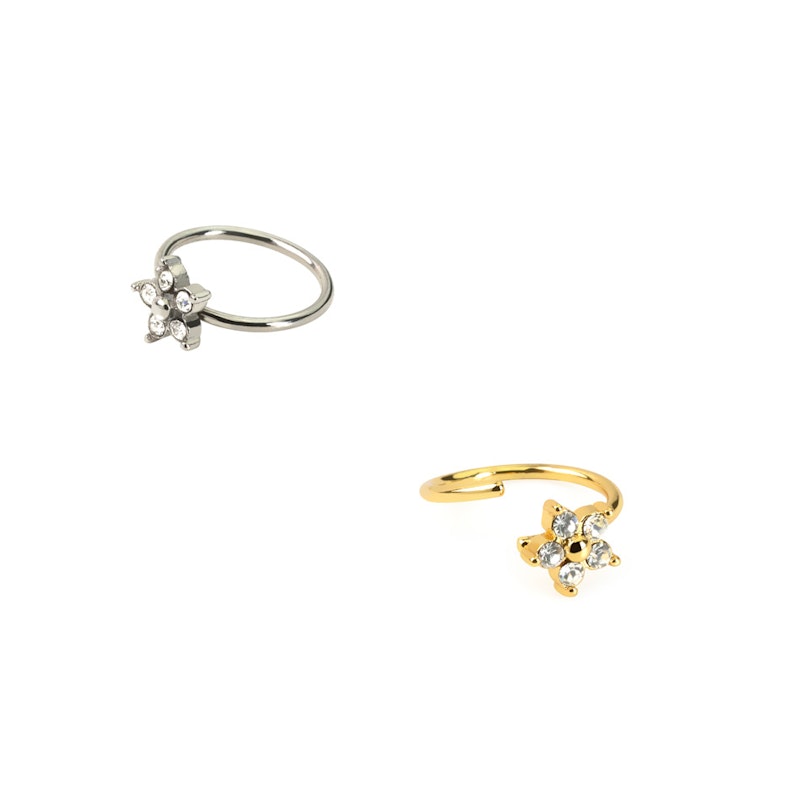To delikatne kółko ze stali chirurgicznej ma delikatny wzór kwiatuszka, który składa się z pięciu płatków kamieni szlachetnych wokół centralnego koralika. Kolczyk dostępny jest w złotym lub srebrnym wykończeniu, wykonany ze stali chirurgicznej, dzięki czemu jest trwały i nie matowieje. Dzięki cienkiemu gwintowi o rozmiarze 0,8 mm, kolczyk ten będzie świetnie pasował do piercingów nosa, ale można go również nosić w helixie i innych piercingach ucha. Aby go otworzyć, wystarczy lekko przekręcić, umieścić w przekłuciu i ponownie przekręcić, aby zabezpieczyć.