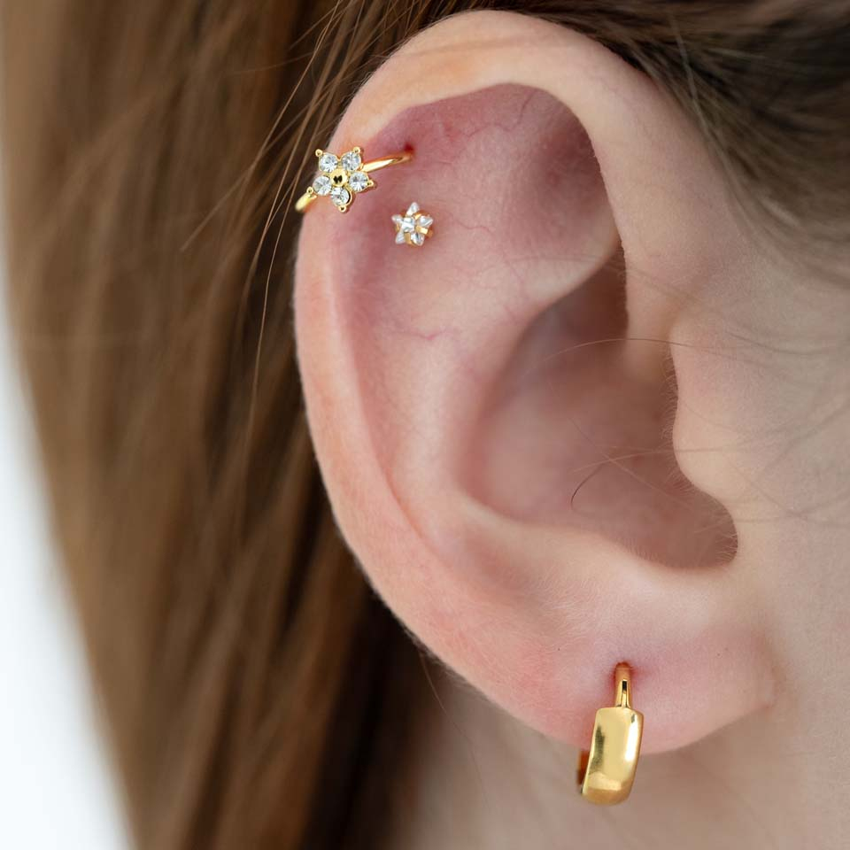 To delikatne kółko ze stali chirurgicznej ma delikatny wzór kwiatuszka, który składa się z pięciu płatków kamieni szlachetnych wokół centralnego koralika. Kolczyk dostępny jest w złotym lub srebrnym wykończeniu, wykonany ze stali chirurgicznej, dzięki czemu jest trwały i nie matowieje. Dzięki cienkiemu gwintowi o rozmiarze 0,8 mm, kolczyk ten będzie świetnie pasował do piercingów nosa, ale można go również nosić w helixie i innych piercingach ucha. Aby go otworzyć, wystarczy lekko przekręcić, umieścić w przekłuciu i ponownie przekręcić, aby zabezpieczyć.