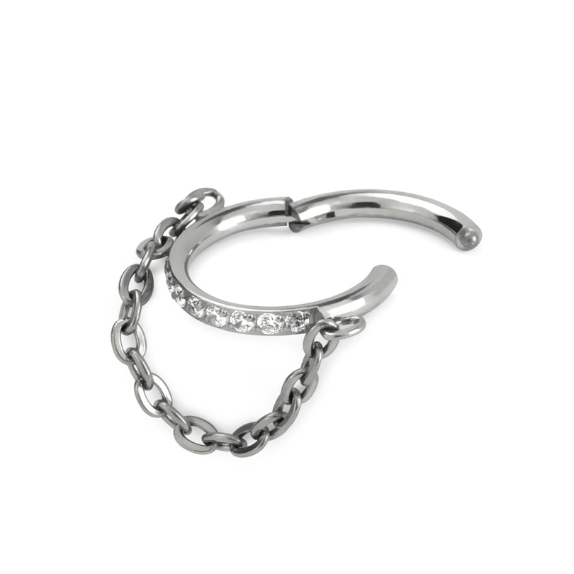Kółko z tytanu zamykane zawiasem oraz zdobione rzędem kamieni i łańcuszkiem. Ten ostatni przymocowany jest do kółka po obu stronach, mniej więcej w jego połowie i zwisa nieco poniżej dolnej części kółka.