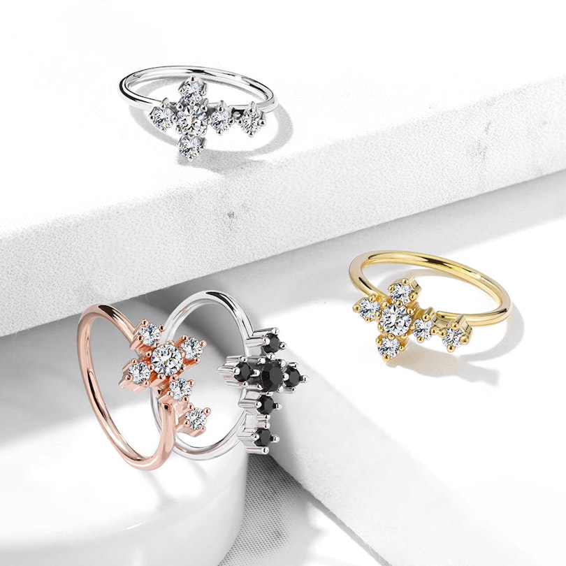 Z przodu kółko jest zdobione ładnym krzyżem, który wysadzany jest sześcioma kamieniami w kolorach do wyboru. Możesz wybrać model z przezroczystymi lub czarnymi cyrkoniami.