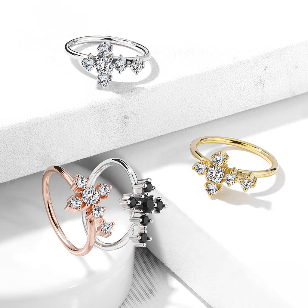 Z przodu kółko jest zdobione ładnym krzyżem, który wysadzany jest sześcioma kamieniami w kolorach do wyboru. Możesz wybrać model z przezroczystymi lub czarnymi cyrkoniami.