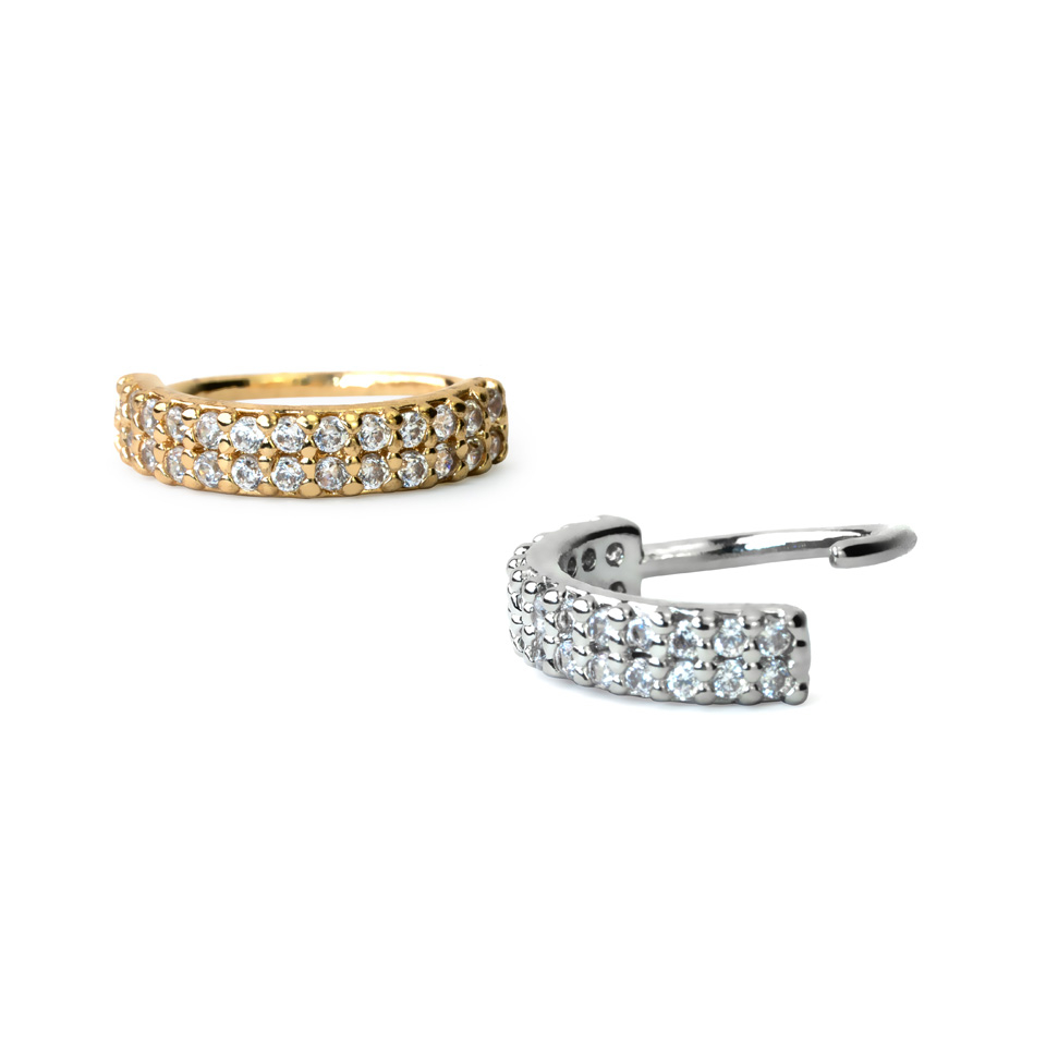 Połowa kółka zdobiona jest dwoma rzędami przezroczystych cyrkonii, których jest w sumie 26. Pozostała część biżuterii będzie znajdować się w przekłuciu.