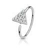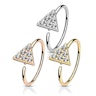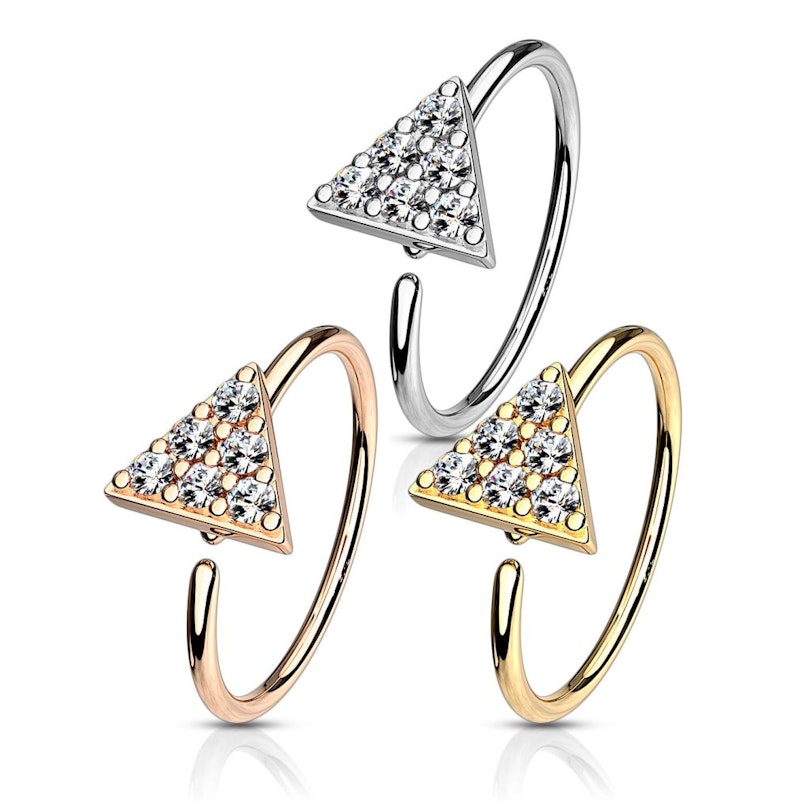 Jak widać na zdjęciu, mamy dostępne trzy modele w różnych kolorach do wyboru. Biżuteria jest pokryta różnymi powłokami, zatem jeśli zdecydujesz się na złoty model, będzie ona powleczona warstwą 14 karatowego złota. W przedniej części widzimy ładny trójkątny wzór zdobiony błyszczącymi kamieniami o przezroczystym kolorze.
