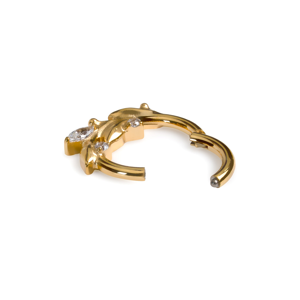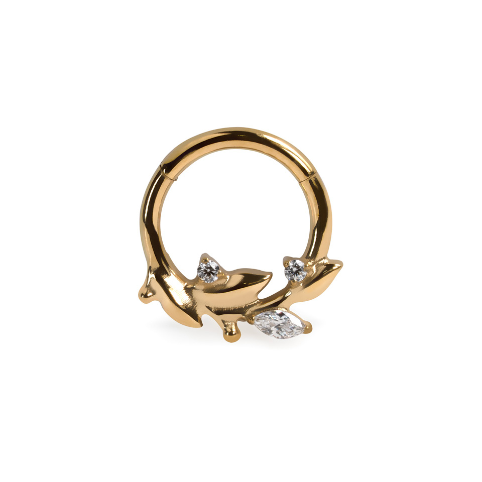 To piękne kółko z delikatnym liściem jest wykonane z tytanu, co oznacza, że nadaje się do skóry wrażliwej. Wyposażone w mały zawias łatwo umieścić w piercingu.