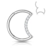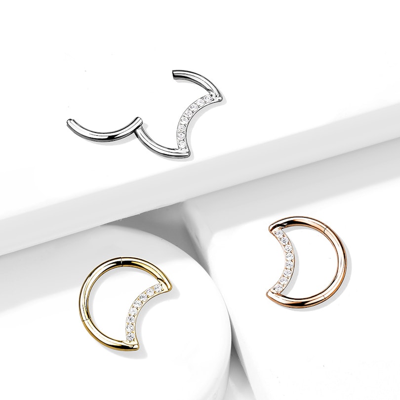 Biżuterię charakteryzują wysokiej jakości detale, gdyż tytan to drogi materiał. Ten model jest także wyposażony w mały zawias, który często spotyka się w wysokiej jakości biżuterii. Kamienie zdobiące półksiężyc są precyzyjnie ułożone w linii prostej -- jeśli zapomnimy o tym, że mają formę łuku.