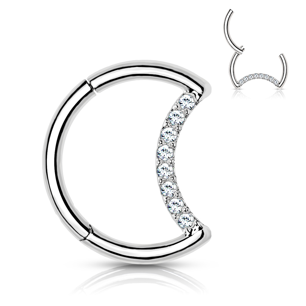 Biżuterię charakteryzują wysokiej jakości detale, gdyż tytan to drogi materiał. Ten model jest także wyposażony w mały zawias, który często spotyka się w wysokiej jakości biżuterii. Kamienie zdobiące półksiężyc są precyzyjnie ułożone w linii prostej -- jeśli zapomnimy o tym, że mają formę łuku.