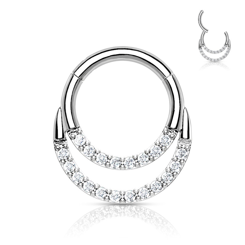 Biżuteria posiada dwa zakrzywione rzędy przezroczystych, drobnych kamieni. Jeden z nich jest częścią kółka, kiedy drugi jest dodatkowym elementem i jest do niego doczepiony. Ilość kamieni w rzędzie jest proporcjonalna do średnicy kółka, które wybierzesz.