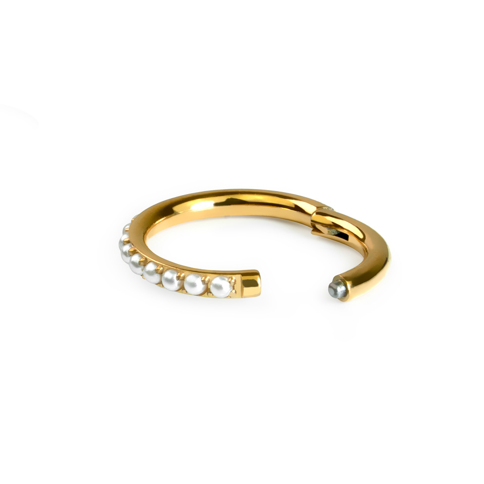 Dodaj odrobinę elegancji do swoich piercingów z tym oszałamiającym kółkiem, wysadzanym syntetycznymi perłami, które nadają mu szyk i nieprzemijający styl.