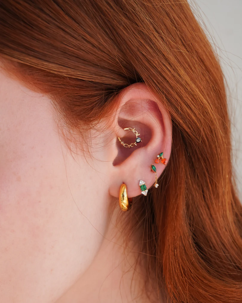 Oferowany w złotym lub srebrnym wykończeniu, ten kolczyk typu huggy będzie pięknie wyglądał w piercingu daith, helixie, rook lub płatku ucha.