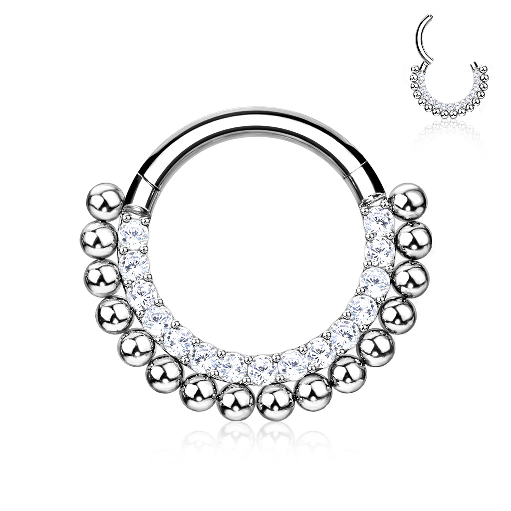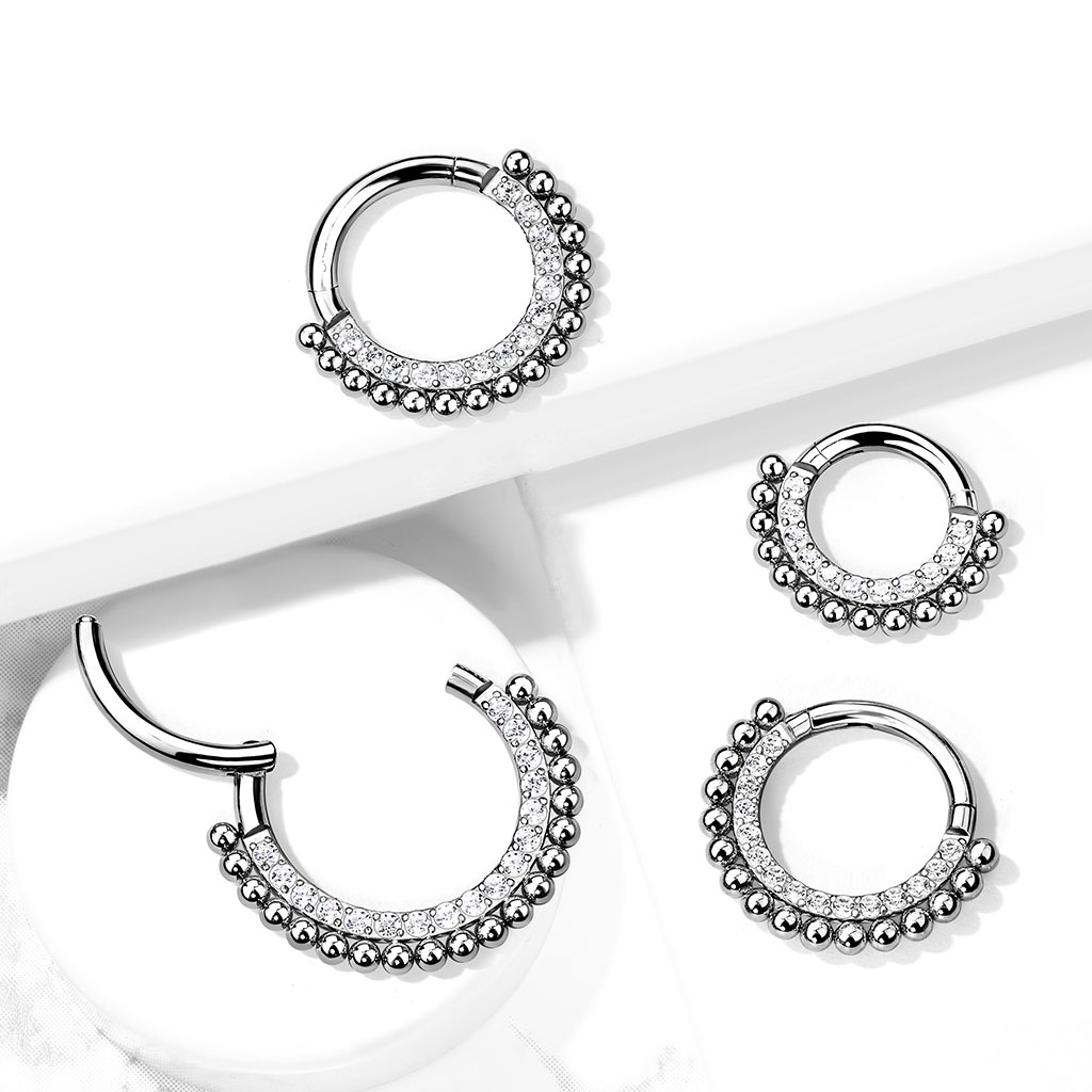 Tytan to jeden z najlepszych materiałów, które możesz nosić w piercingu. Z tego samego powodu, biżuteria z tytanu jest używana w nowych przekłuciach. Kolczyki z tytanu mogą być nudne, szczególnie jeśli nie mają kamieni lub innych zdobień. Ten prezentowany model jest jednak nieco inny za sprawą kamieni i małych koralików, które otaczają pierścień.