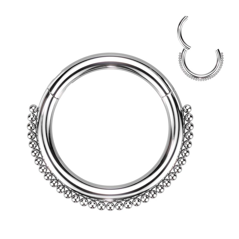 To kółko segmentowe zdobione jest z przodu rzędem drobnych koralików. Dzięki swojej konstrukcji skierowanej do przodu, idealnie sprawdzi się w septum i w piercingu ucha.