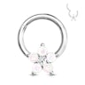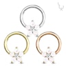 Na zdjęciu prezentujemy niekończące się kółko, które wyposażone jest w mały zawias. Dzięki niemu łatwo otworzyć i zamknąć biżuterię, co jest bardzo praktyczne. Już teraz nie musisz martwić się, że zgubisz któryś element kolczyka. Przednia część kółka zdobiona jest małym kwiatem, który tworzy 5 opali. Pośrodku kwiatu widać małą, przezroczystą cyrkonię.