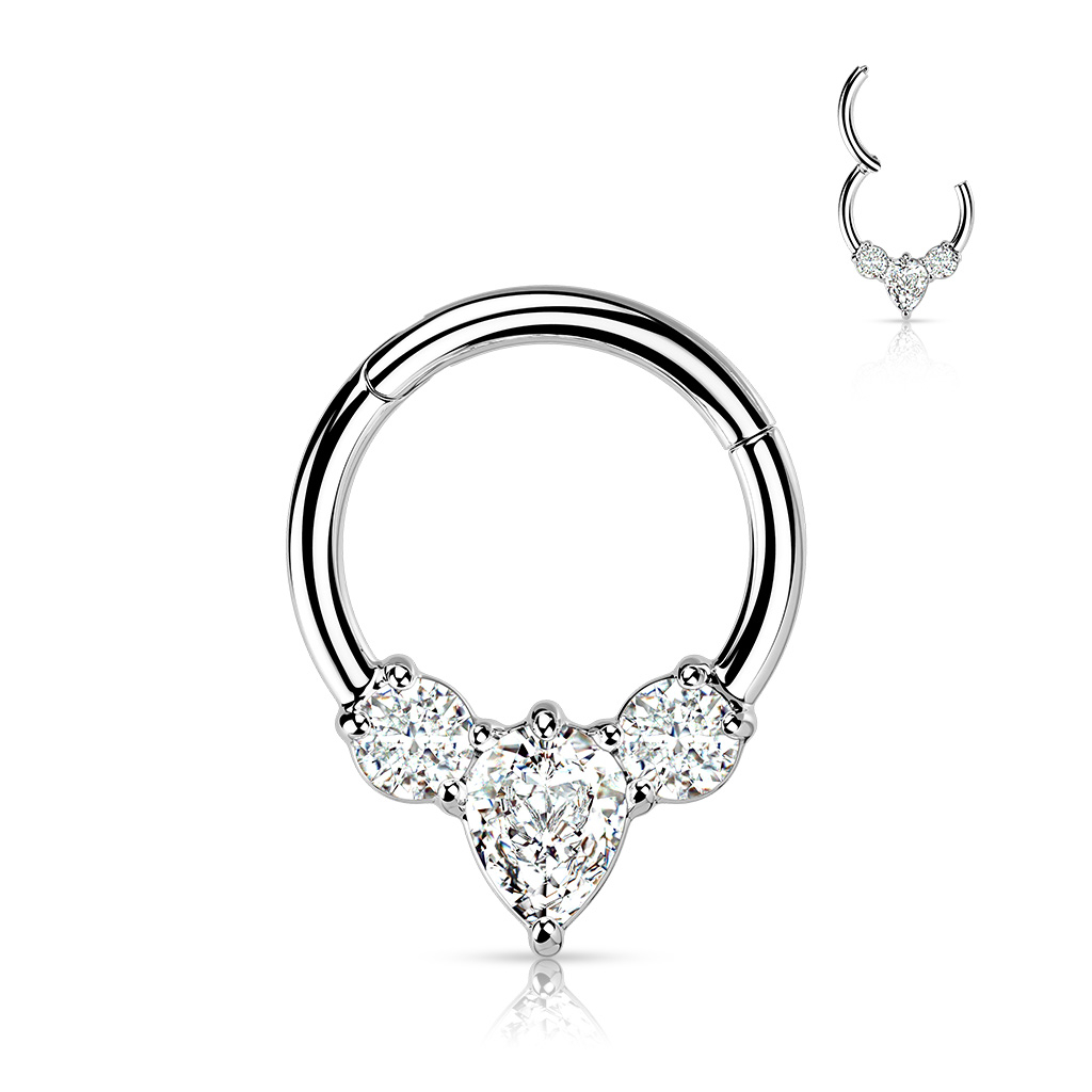 To kółko wykonane z solidnej stali chirurgicznej dostarcza tego wszystkiego, czego potrzebuje piercing. Biżuteria ma trwałą powłokę PVD, dzięki czemu oferuje wiele kolorów, które są bardziej trwałe niż standardowe. Kółko zdobione jest ciekawym wzorem większego kamienia w kształcie gruszki, oraz mniejszymi i okrągłymi kamieniami po bokach. Kamienie są skierowane do przodu, dzięki czemu kółko najlepiej sprawdzi się w piercingu septum i niektórych przekłuciach ucha, jak daith i tragus.