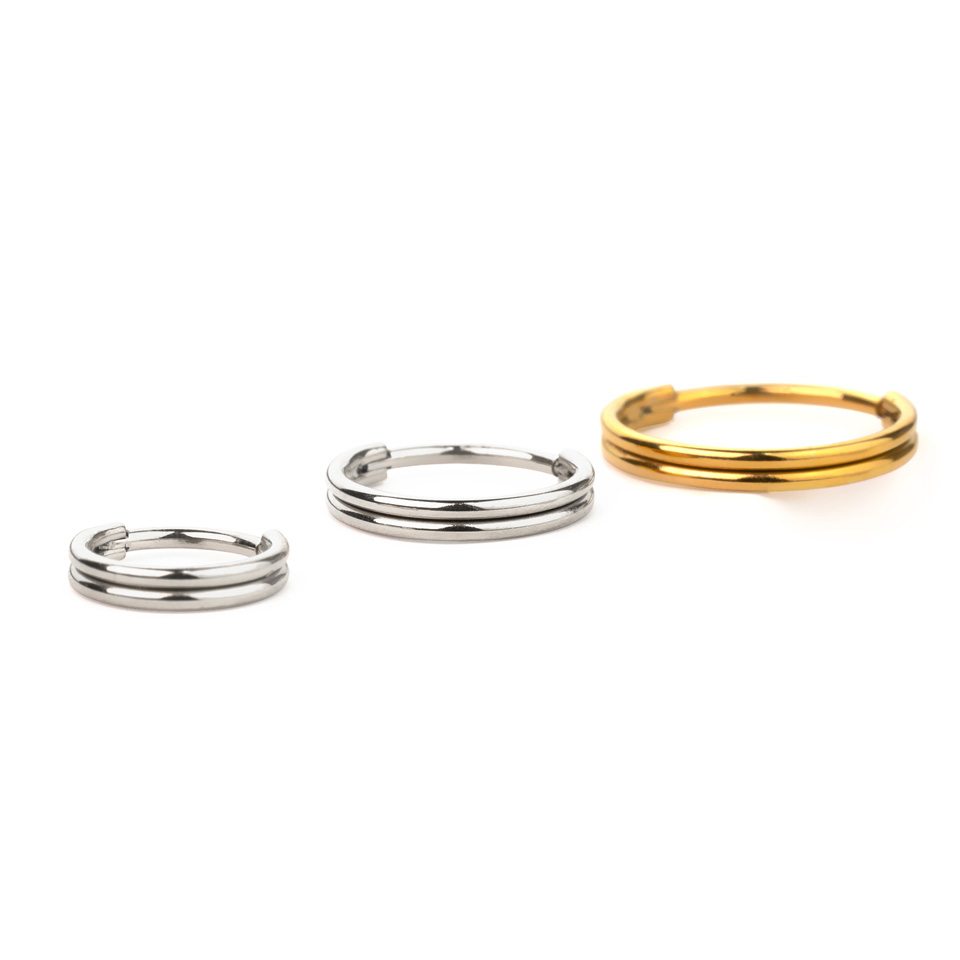 To segmentowe kółko zamykane zawiasem ma wygląd podwójnych kółek przylegających do siebie, ale tylko jedno z nich przechodzi przez piercing.