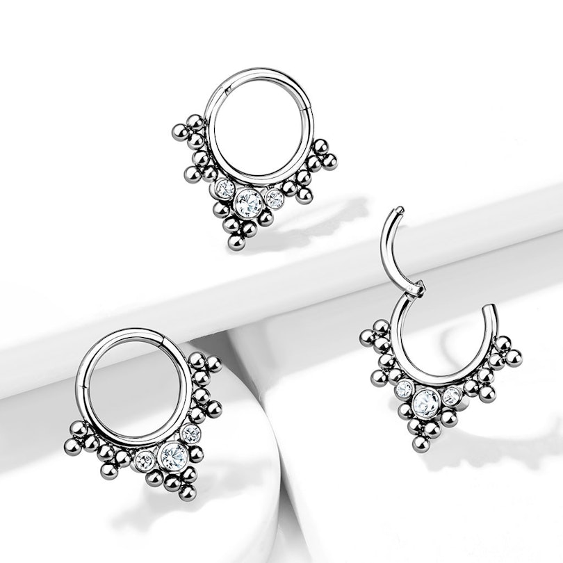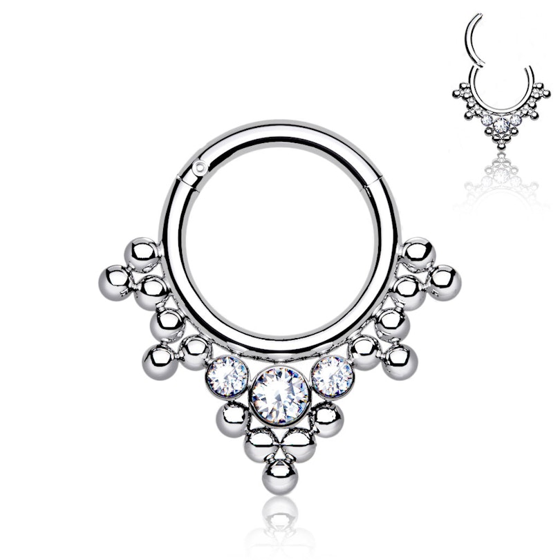 Kolczyk jest wykonany z tytanu, który jest jednym z najlepszych materiałów do Twojego piercingu. Dostępny w dwóch rozmiarach, 8 mm i 10 mm. Oba rozmiary mają grubość 1,2 mm, która jest standardowym rozmiarem w przekłuciu uszu i nosa. W dolnej części kółko zdobione jest grupą kamieni i koralików. Dwa kamienie są mniejsze i jeden nieco większy, a całość tworzy piękny, symetryczny wzór.