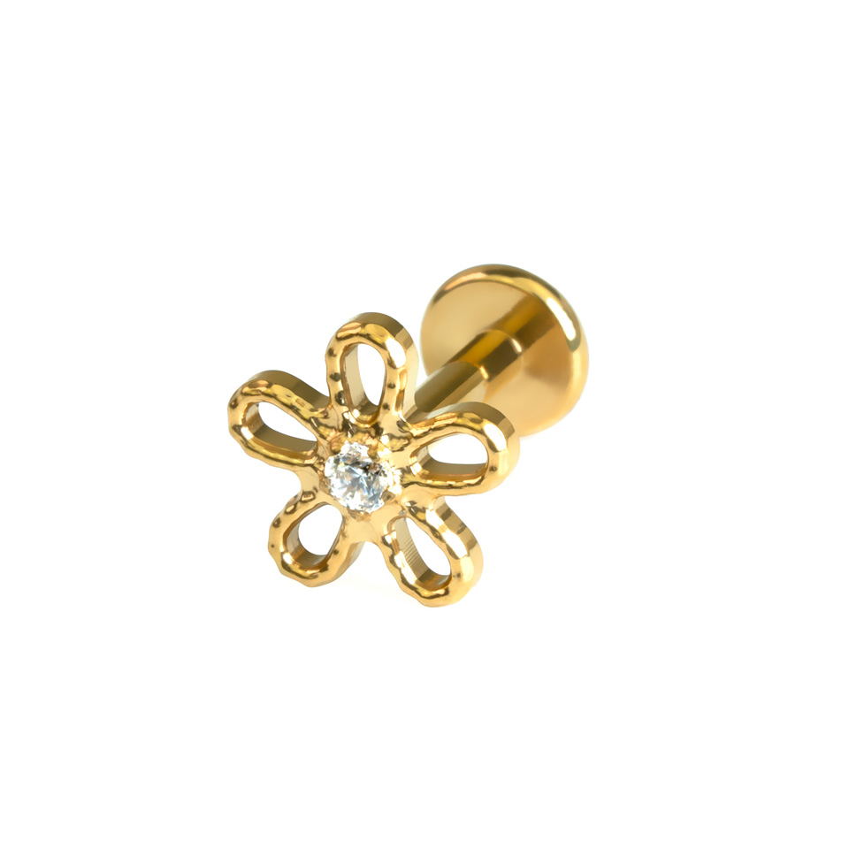 Nasz uroczy labret w kształcie stokrotki zdobiony jest centralnym kamieniem, który dodaje mu blasku. Wyposażony jest w gwint wewnętrzny, zatem jest łatwy w zakładaniu — wystarczy wsunąć pręcik w otwór piercingu i zabezpieczyć na górze topem. Biżuteria wykonana jest z hipoalergicznego tytanu, zatem nadaje się doskonale do skóry wrażliwej. Labret oferowany jest w złotym lub srebrnym wykończeniu, możesz także wybrać odpowiednią długość, która najlepiej pasuje do Twojego piercingu. Ten kolczyk w kształcie stokrotki na pewno doda Tobie dużo uroku.