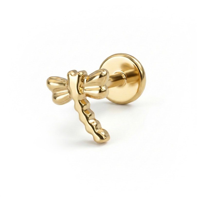 Ten uroczy labret ma wzór ważki. Wykonany z tytanu, zapewnia komfort noszenia nawet dla skóry wrażliwej. Niewielki rozmiar (ważka ma 5.8 mm) oznacza, że ten element nadaje się do różnych piercingów w uchu. Labret posiada wpychane zapięcie push-in, które sprawia, że zabezpieczenie kolczyka jest super proste i bezpieczne.