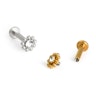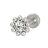 Z przodu labret zdobiony jest kwiatem z przezroczystym kamieniem, który z kolei wyposażony jest w gwint wewnętrzny, co jest dużą zaletą podczas zakładania i zdejmowania biżuterii. Dzięki takiemu rozwiązaniu nie podrażnisz i nie uszkodzisz skóry.