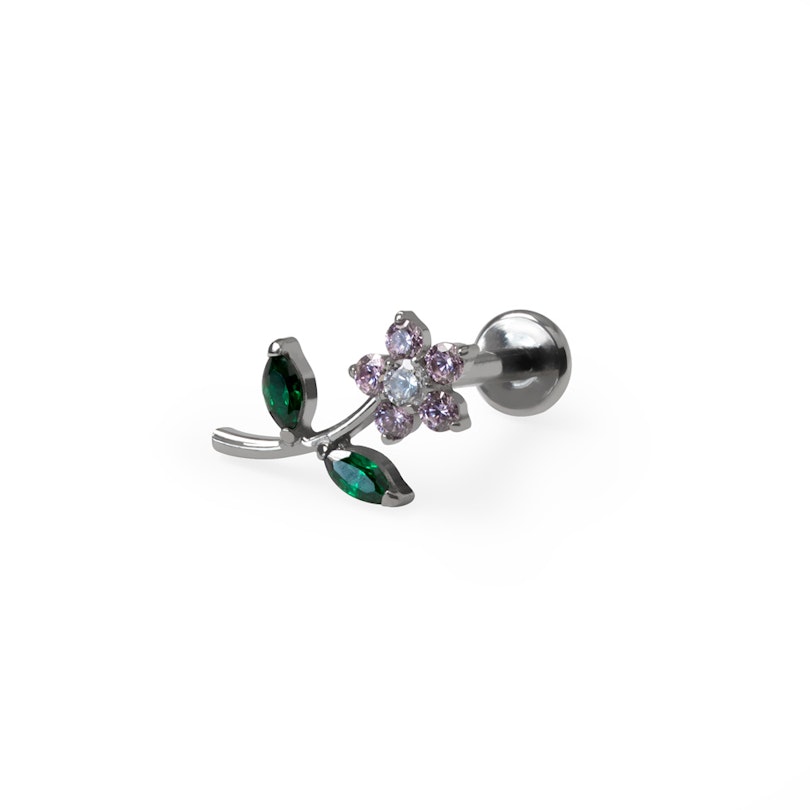 Uroczy kwiat w labrecie z płaskim zapięciem, który wprowadzi wiosenny akcent do Twojej kolekcji biżuterii. Kwiat osadzony w pazurkach i z akcentami zielonych liści, stanowi zabawne połączenie detali i codziennej funkcjonalności. Wykonany ze stali chirurgicznej 316L jest wytrzymały, wodoodporny i przyjazny dla większości rodzajów skóry.