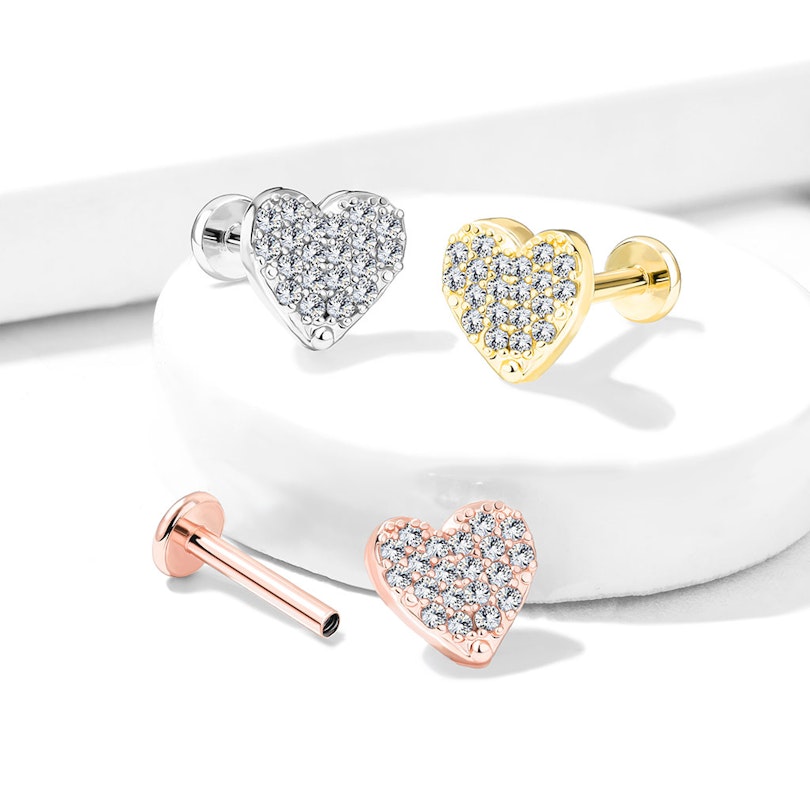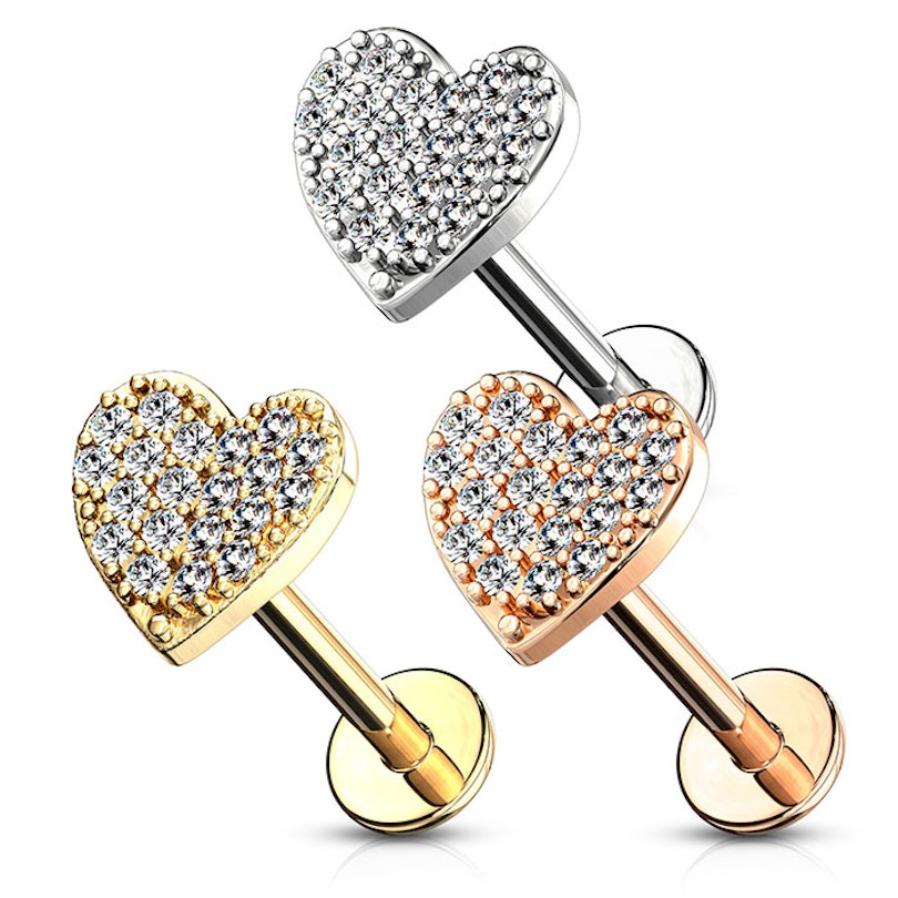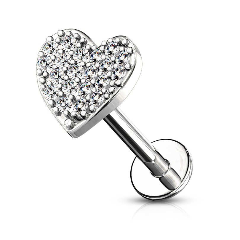 Wzory serc w projektach biżuterii będą zawsze popularne. Ten słodki labret z motywem serca, tworzą liczne kamienie, co sprawia że pięknie rozświetlają biżuterię. Labret jest wyposażony w wewnętrzny gwint, zatem serce działa jako mechanizm zamykający. Posiada ono małą śrubkę, którą należy wepchnąć w środek labretu. Ten typ zapięcia jest bardzo praktyczny i wygodny, gdyż nie podrażnisz swojej skóry w momencie jego zakładania lub zdejmowania.