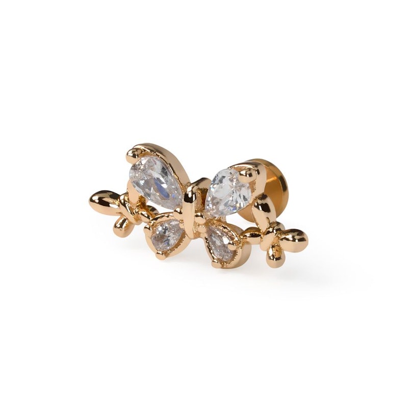 Labret z trzema motylkami to przede wszystkim zabawny szczegół. Pośrodku znajduje się większy motyl wykonany z przezroczystych kamieni osadzonych w pazurkach, podczas gdy dwa mniejsze, złote motylki są umieszczone po dwóch stronach, tworząc delikatne trio pełne charakteru.