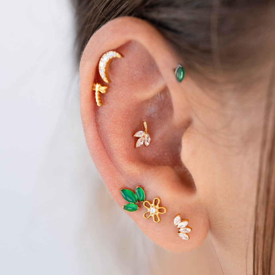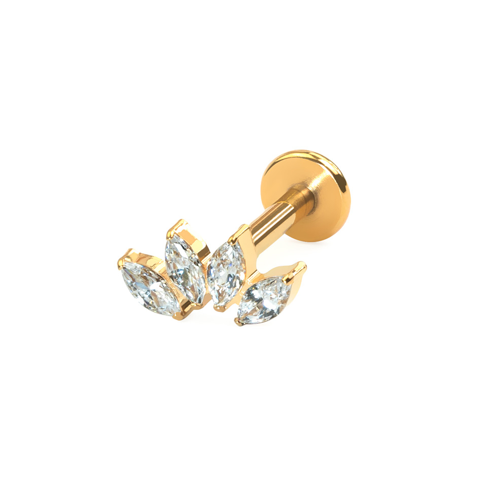 Delikatny labret zdobiony 4 kamieniami o szlifie markizy, które są ułożone w łuk. Kolczyk ten będzie się pięknie prezentował w piercingach ucha, szczególnie w conch lub płaskim piercingu. Wyposażony w gwint wewnętrzny, co oznacza, że wystarczy włożyć płaski pręcik w przekłucie, a na górze zabezpieczyć topem. Kolczyk wykonany jest z tytanu, zatem będzie wygodny w noszeniu, nawet w przypadku skóry wrażliwej.