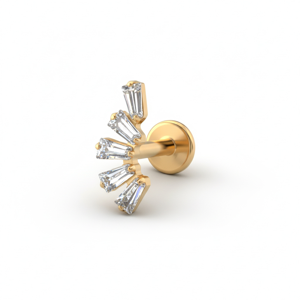 Tytanowy labret z kamieniami o szlifie bagietkowym został stworzony z myślą o momentach, które wymagają uporządkowania. Kamienie są ułożone w równych rzędach, tworząc na uchu estetyczną kompozycję, która podkreśla równowagę.