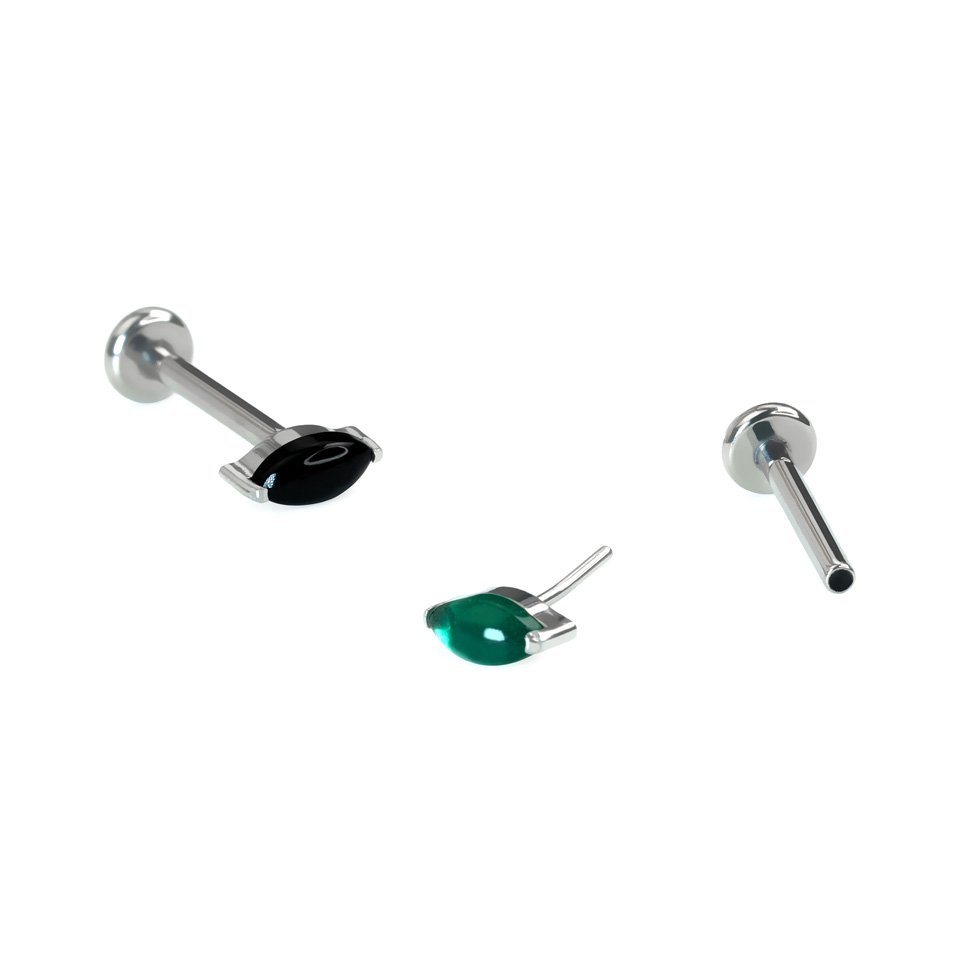Ten labret z tytanu zdobiony jest naturalnym kamieniem onyks o szlifie markizy w zielonym lub czarnym kolorze. Kamień jest przymocowany do kolczyka za pomocą delikatnych ząbków.