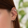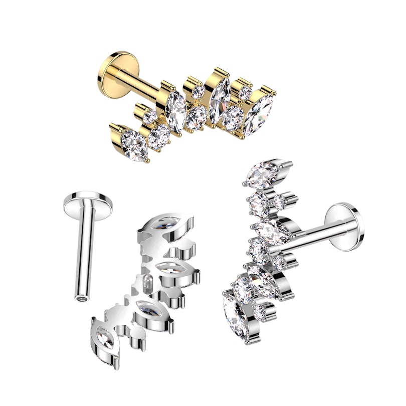 Ten piękny labret z tytanu ma przeplatające się markizy i okrągłe przezroczyste kamienie. Zakrzywiony kształt tego kolczyka sprawdzi się szczególnie w płatku ucha i helixie, gdzie ładnie podąża za kształtem ucha.