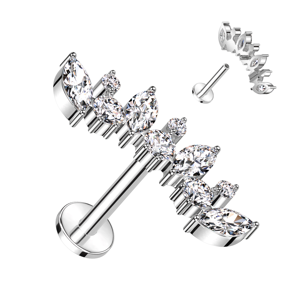 Ten piękny labret z tytanu ma przeplatające się markizy i okrągłe przezroczyste kamienie. Zakrzywiony kształt tego kolczyka sprawdzi się szczególnie w płatku ucha i helixie, gdzie ładnie podąża za kształtem ucha.