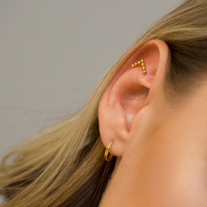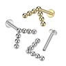 Labret z tytanu z modnym szewronowym wzorem wykonanym z 7 koralików. Każdy z nich ma 2 mm. Każda ze stron z koralikami mierzy 7.8 mm. Kolczyk oferowany jest w dwóch wersjach, złotej i srebrnej.