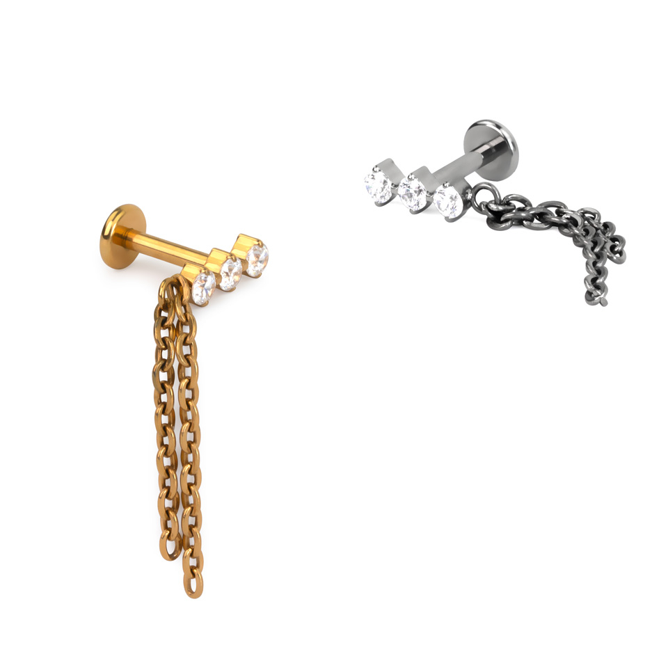Ten stylowy labret ozdobiony jest rzędem trzech oprawionych cyrkonii z dwoma łańcuszkami przymocowanymi za pomocą małej pętli na jednym końcu. Łańcuszki mają różne długości, co daje fajny asymetryczny efekt.