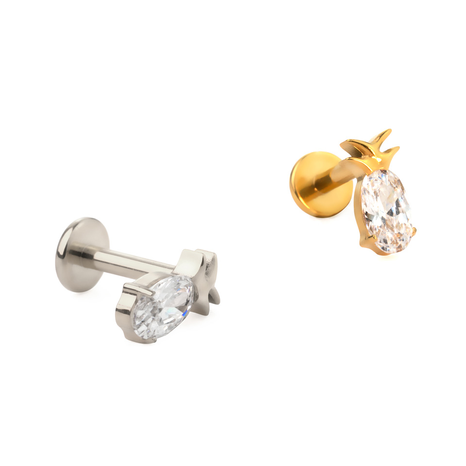 Ten urzekający labret z tytanu jest bardzo tropikalny, gdyż zdobiony słodkim wzorem ananasa. Wysadzany sześciennymi cyrkoniami dla dodatkowego blasku z pewnością przyciągnie niejedno spojrzenie.