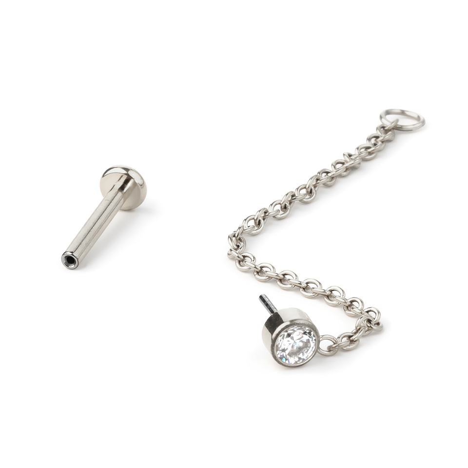 Ten prosty labret ma oprawiony kamień szlachetny i łańcuszek przymocowany do dolnej jego części za pomocą małej pętli. Łańcuszek ma większą pętlę na drugim końcu, dzięki czemu można go przymocować do tylnej części labretu, tak aby owinął się nad uchem, lub połączyć go z innym elementem biżuterii ucha.