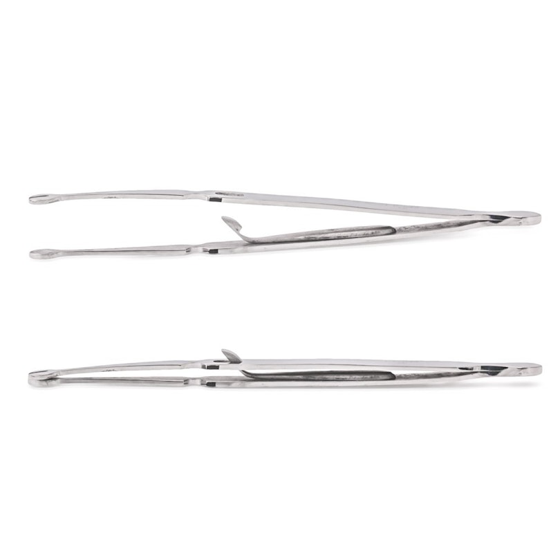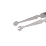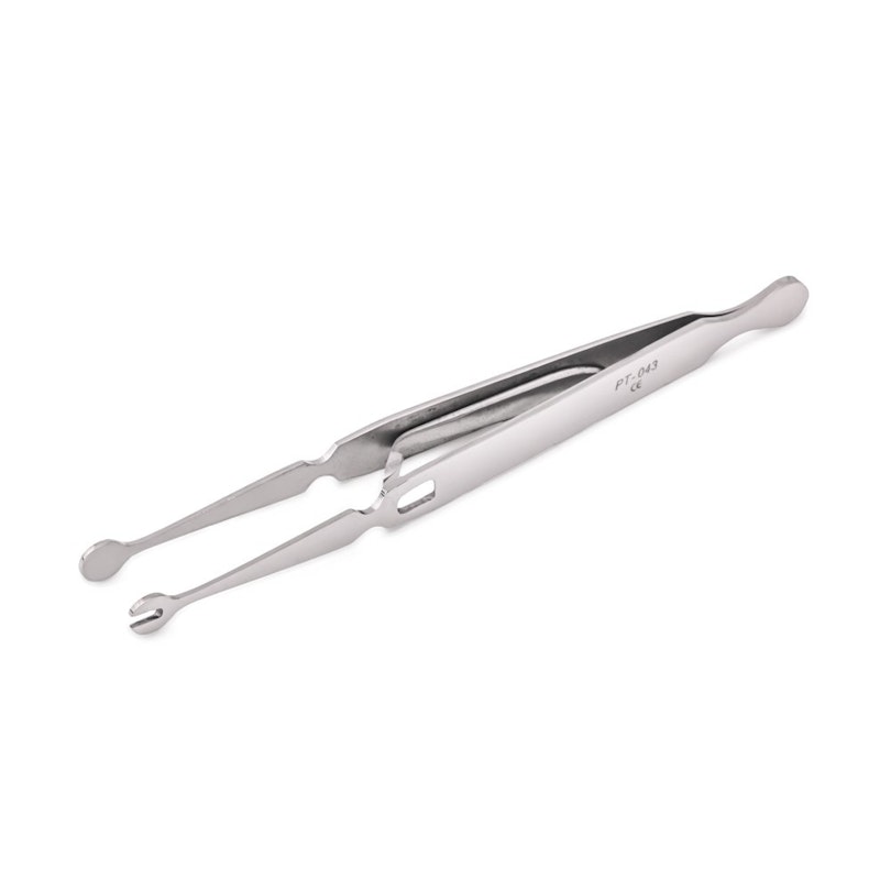 Jak widać na zdjęciu, pęseta ma dwa ramiona a w jednym z nich jest otwór, dzięki któremu można łatwo chwycić i umieścić labret szczególnie w trudno dostępnych miejscach.