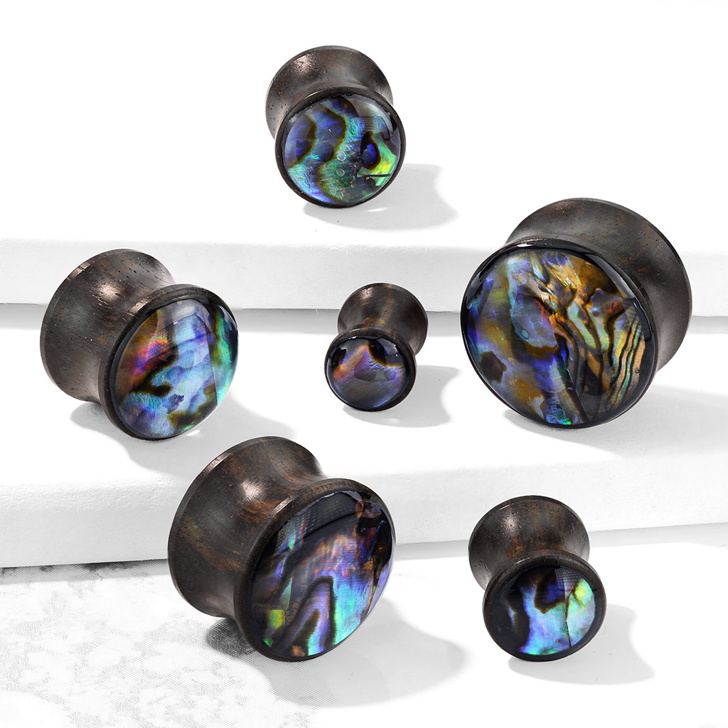 Ten plug wykonany jest z drewna i składa się tylko z jednego kawałka. Nie posiada dodatkowych gwintów ani innych elementów, które można łatwo zgubić. Przednia część biżuterii zdobiona jest masą perłową Paua. Zarówno drewno jak i masa perłowa są materiałami organicznymi, dlatego warto pamiętać że jeśli zamówisz dwa będą się nieco różnić między sobą. Macica perłowa charakteryzuje się różnymi kolorami i strukturą, co czyni ten plug wyjątkowym. Masa została przyklejona do pluga, a następnie pokryta grubą warstwą akrylu, który ją chroni. Biżuteria oferowana jest w różnych rozmiarach, najmniejszy to 6 mm, a największy 16 mm. Jak już wcześniej wspomnieliśmy, plug nie posiada gwintów lub dodatkowych części, zatem umieszczenie go w otworze wymaga praktyki. Wystarczy, że rozciągniesz delikatnie otwór ucha i umieścisz plug w środku. Pamiętaj, że drewno nie lubi wilgoci, dlatego radzimy zdejmować go podczas kąpieli.