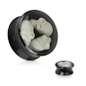 Jeśli poszukujesz biżuterii do rozpychania, która ma dość surowy i odważny wygląd, trafiłeś we właściwe miejsce. Na powyższym zdjęciu widać plug wykonany z akrylu, w środku którego umieszczone są trzy czaszki. Są one ułożone w kręgu i twarzami do przodu. Aby dobrze je zabezpieczyć, plug pokryty jest z przodu przezroczystą powłoką, która stanowi też jego ładne wykończenie.
