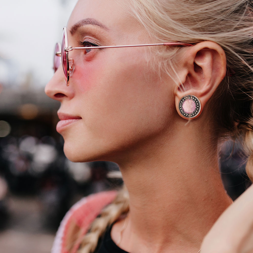 Ten plug został z przodu pokryty antycznym srebrem. Ciemny kolor bardzo ładnie kontrastuje z różowym kamieniem. Dookoła niego widać srebrne kuleczki, które nadają biżuterii głębi i charakteru. Przednia jej część wykonana jest z mosiądzu, natomiast reszta ze stali chirurgicznej. Jak już wspomnieliśmy na początku, frontalna część kolczyka ma ciemniejszy kolor, kiedy pozostałe elementy są powleczone srebrną powłoką. Biżuteria jest przykręcana od tyłu, zatem łatwo można ją założyć.