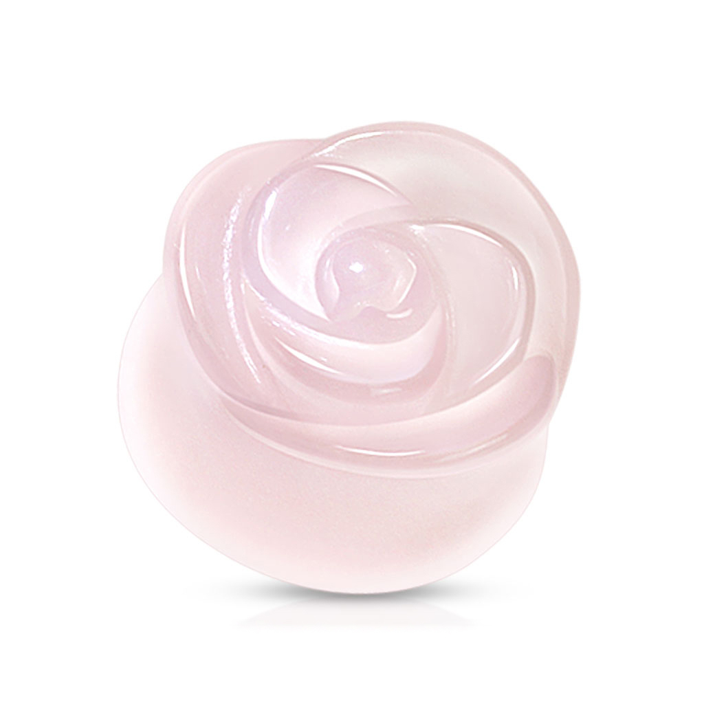 Spójrz na ten klasyczny, różowy plug z kwarcu, który przepięknie się prezentuje. Różowy kwarc jest typem kamienia o jasnoróżowym, przezroczystym kolorze, któremu przypisuje się takie cechy jak pozytywna energia, spokój i miłość. Ten plug z przodu jest zdobiony różą, która została ręcznie rzeźbiona, co podkreśla jej delikatny odcień. Jest ona zdobiona ze szczegółami i wygląda jakby kwitła. Wszystkie elementy tego projektu, jak materiał i kolor promieniują kobiecą energią.