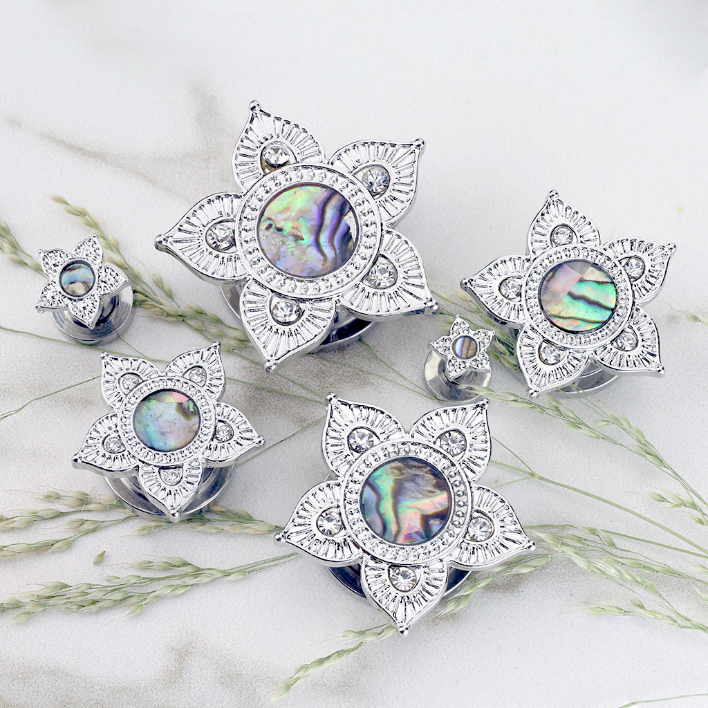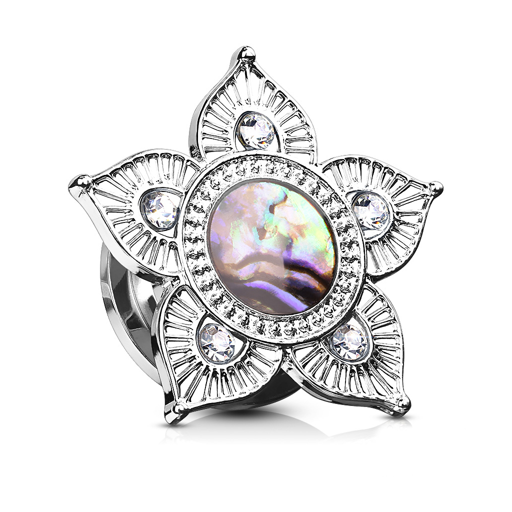 Przypatrz się dobrze temu pięknemu plugowi, jest jedyny w swoim rodzaju! Jego mosiądzowy przód ma kształt kwiatu lotosu. Każdy płatek kwiatu jest ozdobiony zarówno wzorem, jak i cyrkoniami - oprócz mniejszych rozmiarów (3 mm., 4 mm., 5 mm. i 6 mm średnicy). W środku lotosu znajduje się duży kamień ozdobny - abalone. Jest to ozdoba pozyskiwana z muszli, o perłowym kolorze, która pięknie się mieni. Dzięki pięknemu wyglądowi często używa się go podczas wykonywania różnego rodzaju biżuterii, i tak też jest w tym przypadku. Abalone to materiał naturalny, przez co nie ma dwóch identycznych wzorów - dzięki czemu każdy plug jest jedyny w swoim rodzaju.